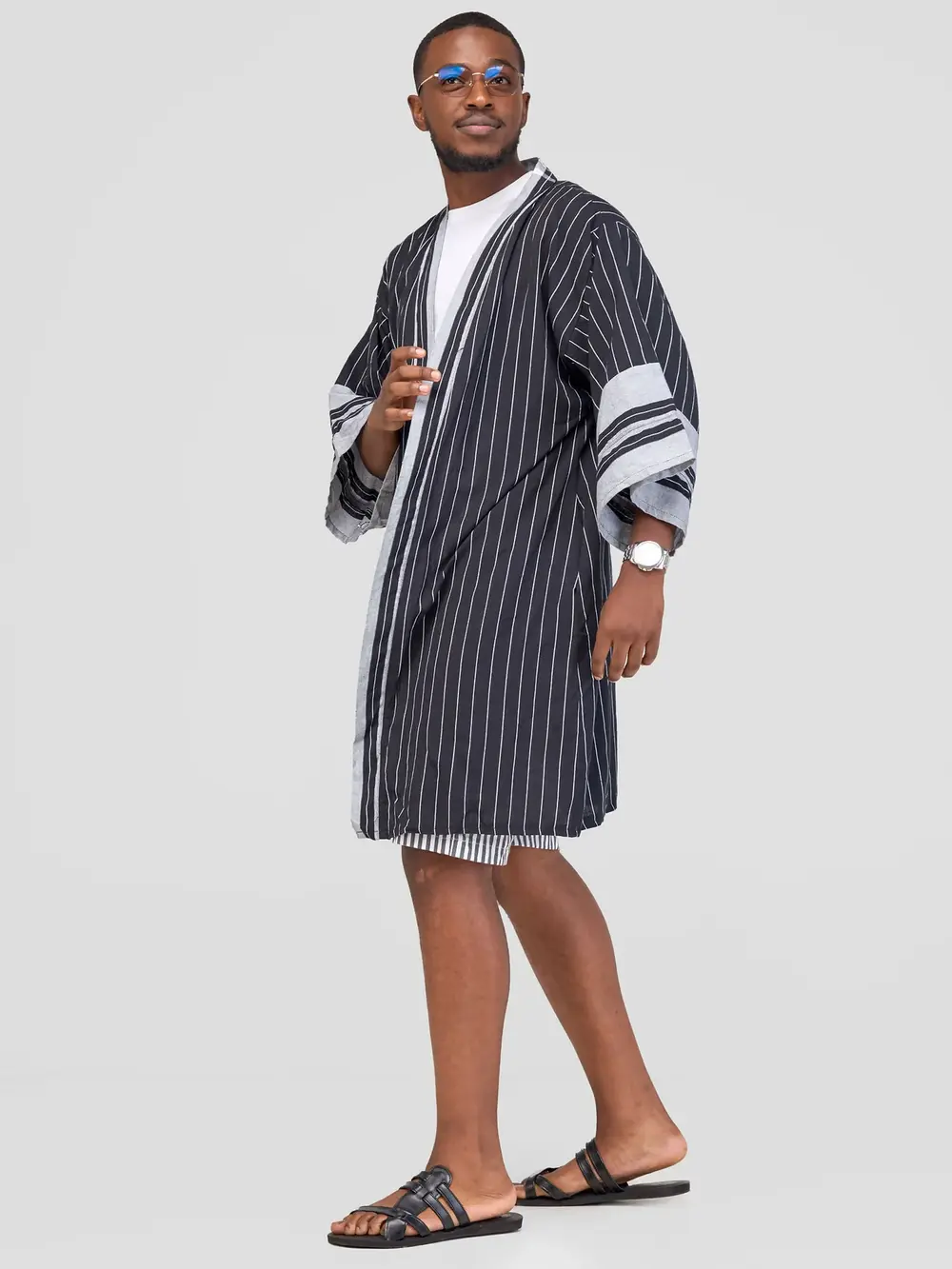 Own your stripes. This kimono is a study in contrast and calm — mid-length and measured, cut from soft black kikoy with grey stripes . Crafted for those who walk with pride in their identity.