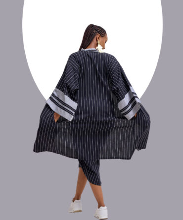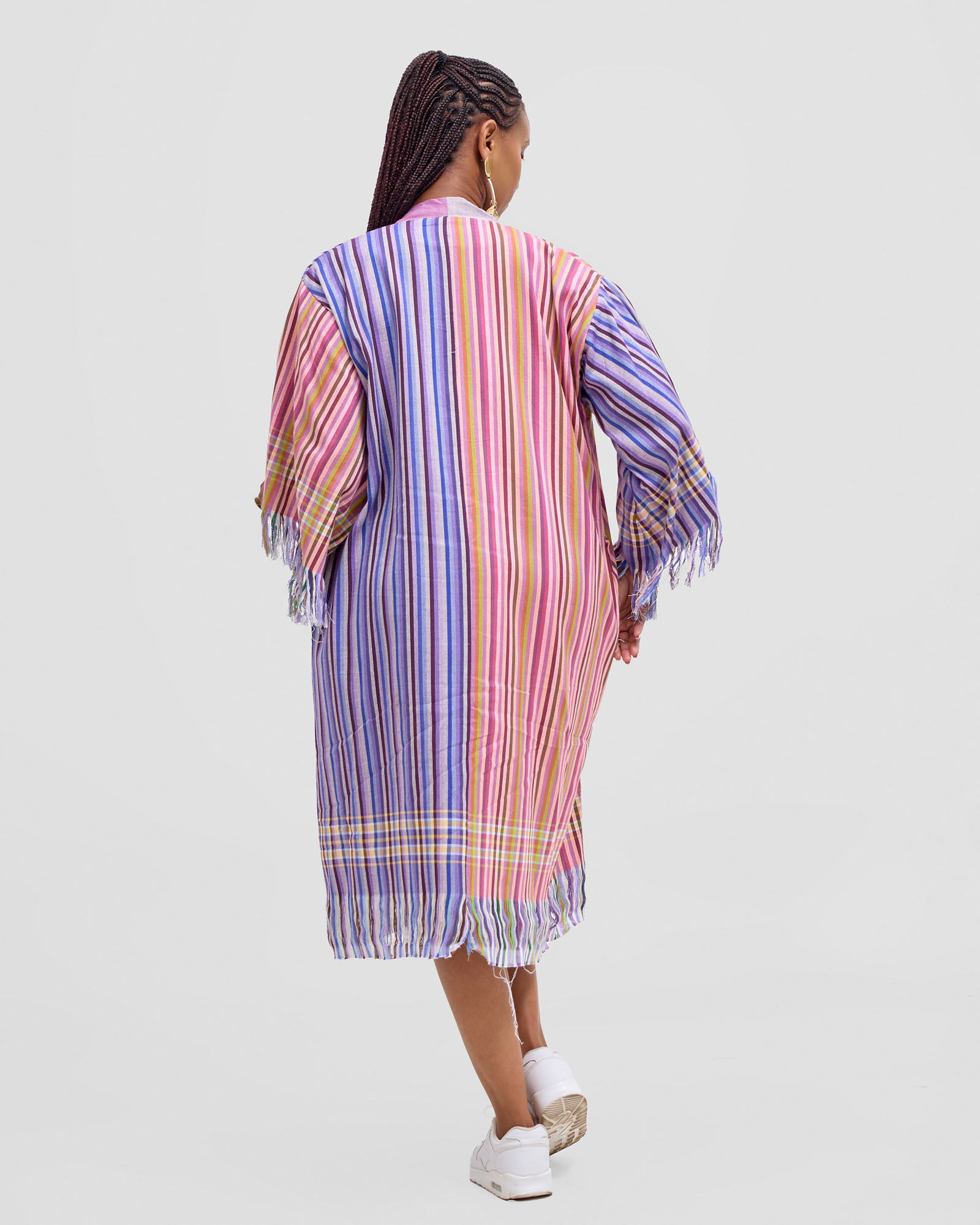 ✔️ Double the Presence – A flowing kikoy kimono and high-cut shorts in radiant pink and purple