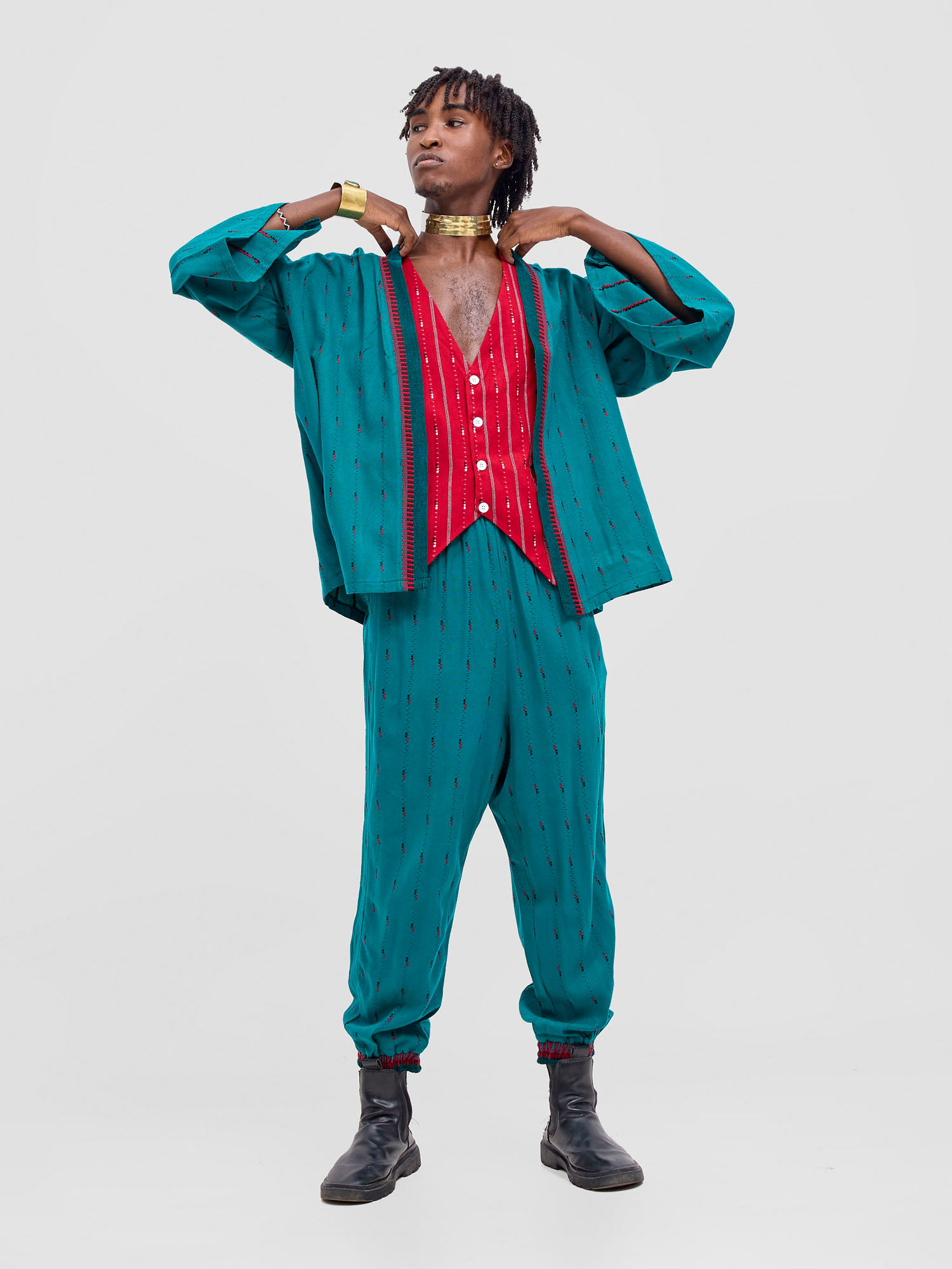 This three-part ensemble makes one loud statement. Featuring a red vest coat, teal wide-leg pants, and a printed short kimono — all cut from breathable Kenyan cotton — TRBL balances contrast, layering, and soft power in motion.